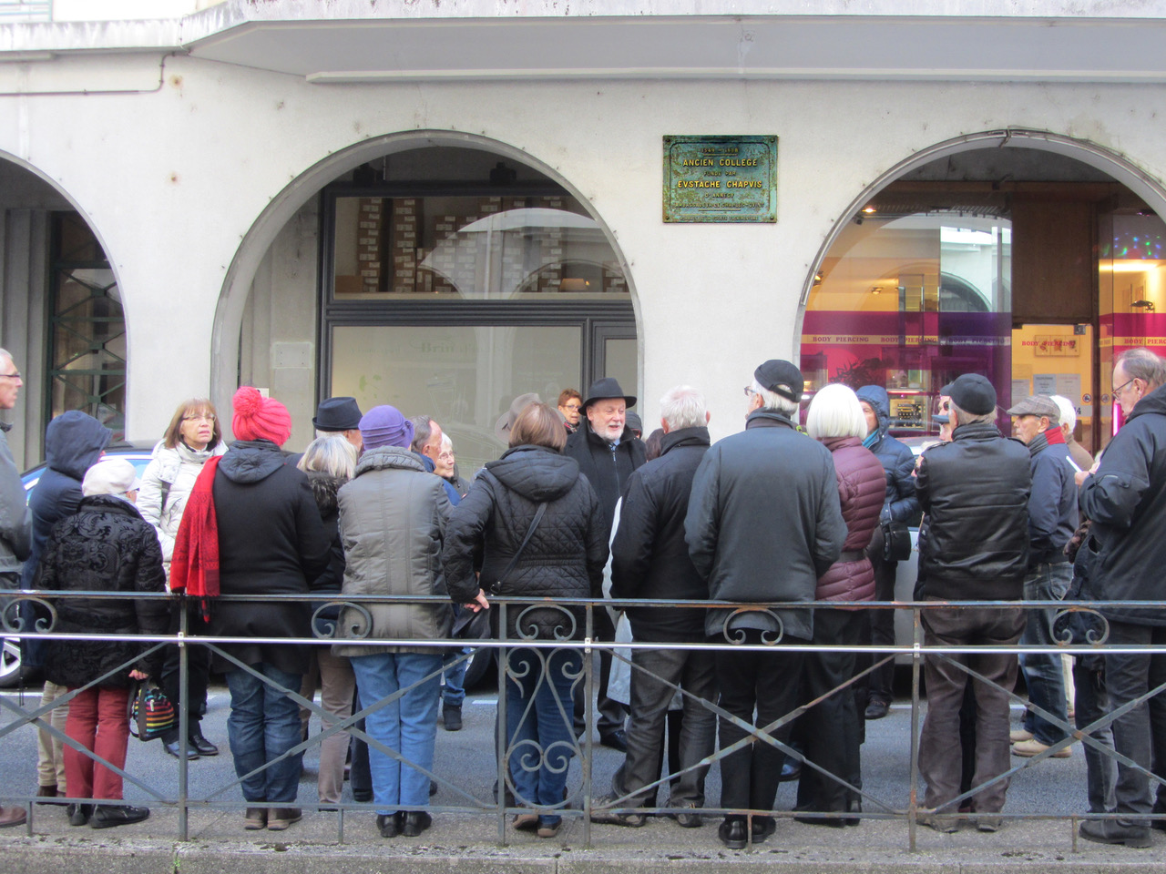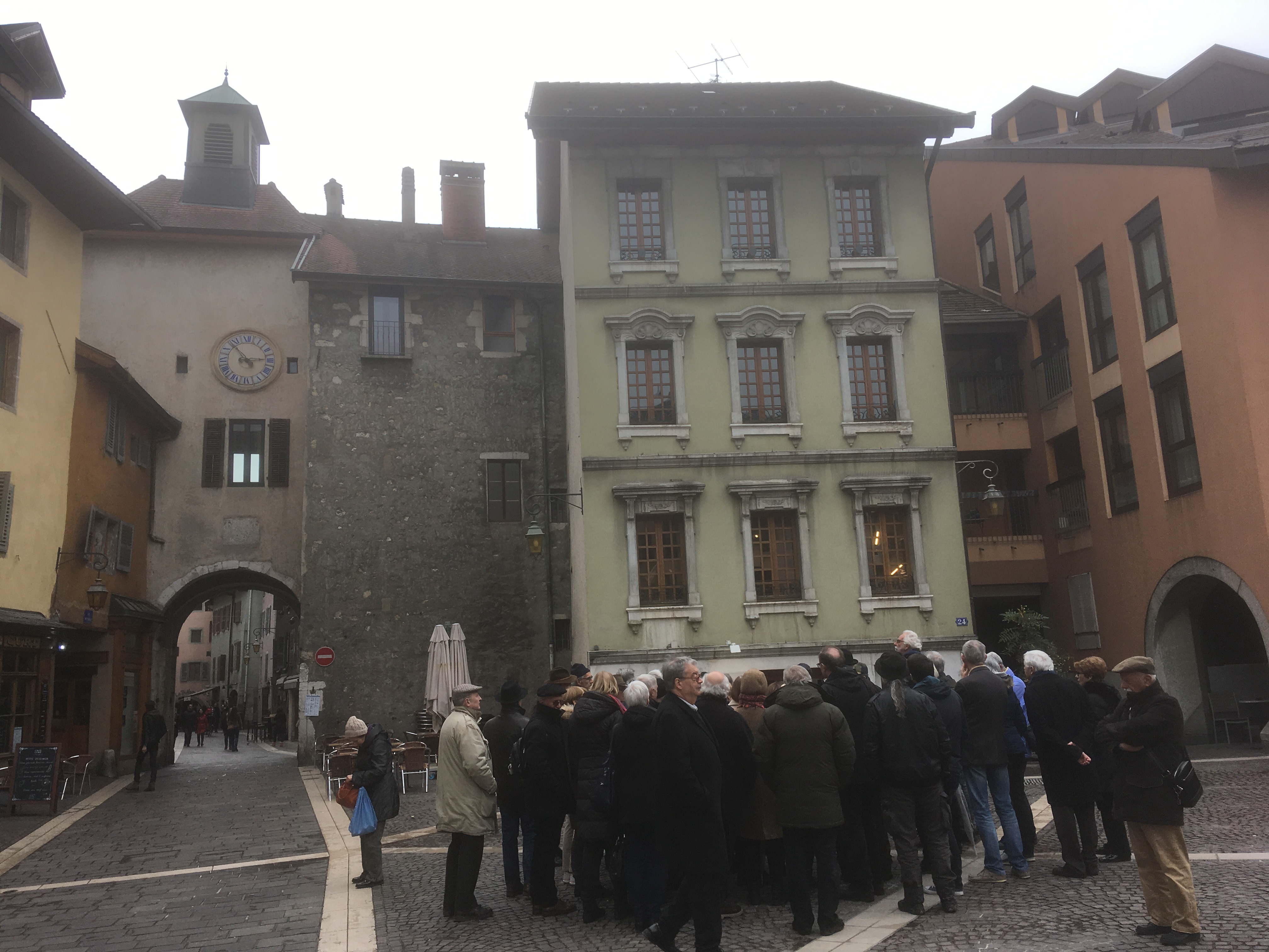 De nombreux sociétaires se sont à nouveau retrouvés place Sainte-Claire pour écouter Danielle Obringer nous conter l'histoire de "la Grande Charrière", cette rue si importante dans la vie d'Annecy. Le parcours le long des arcades a fait surgir de nombreux souvenirs aux annéciens présents. Ici une inscription, là une date gravée, ... même ceux qui ont vécu sans le quartier ont ainsi redécouvert leur rue Sainte-Claire. Avec un brin de nostalgie quand Danielle a montré les photos des commerces des années cinquante et soixante !